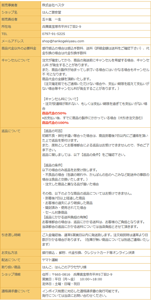 その他ご不明な事がありましたらshop@hankogekiyasu.comまでお気軽にメール下さい。